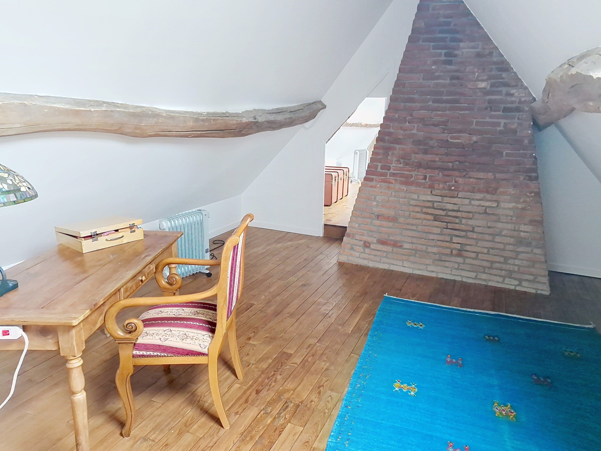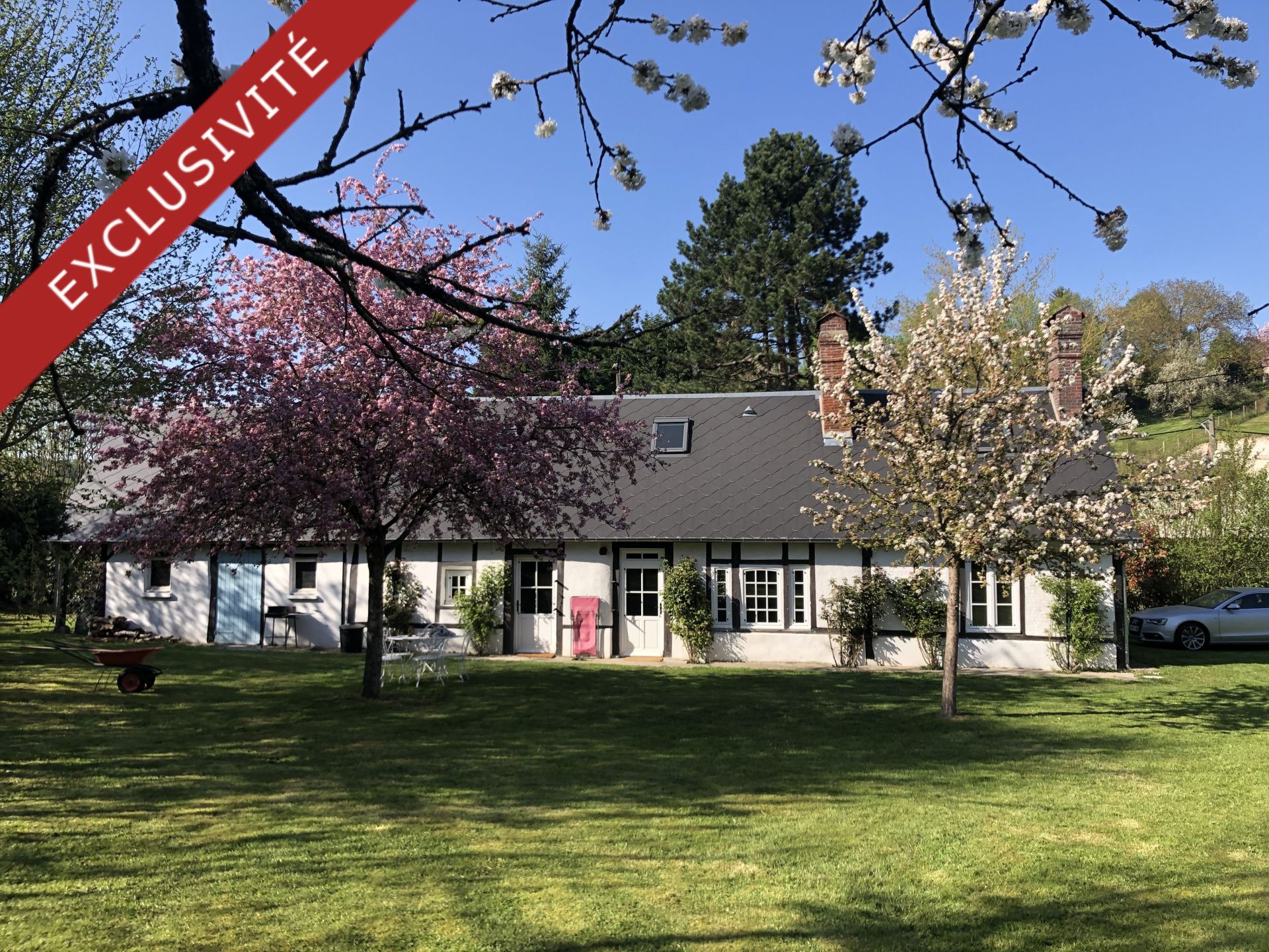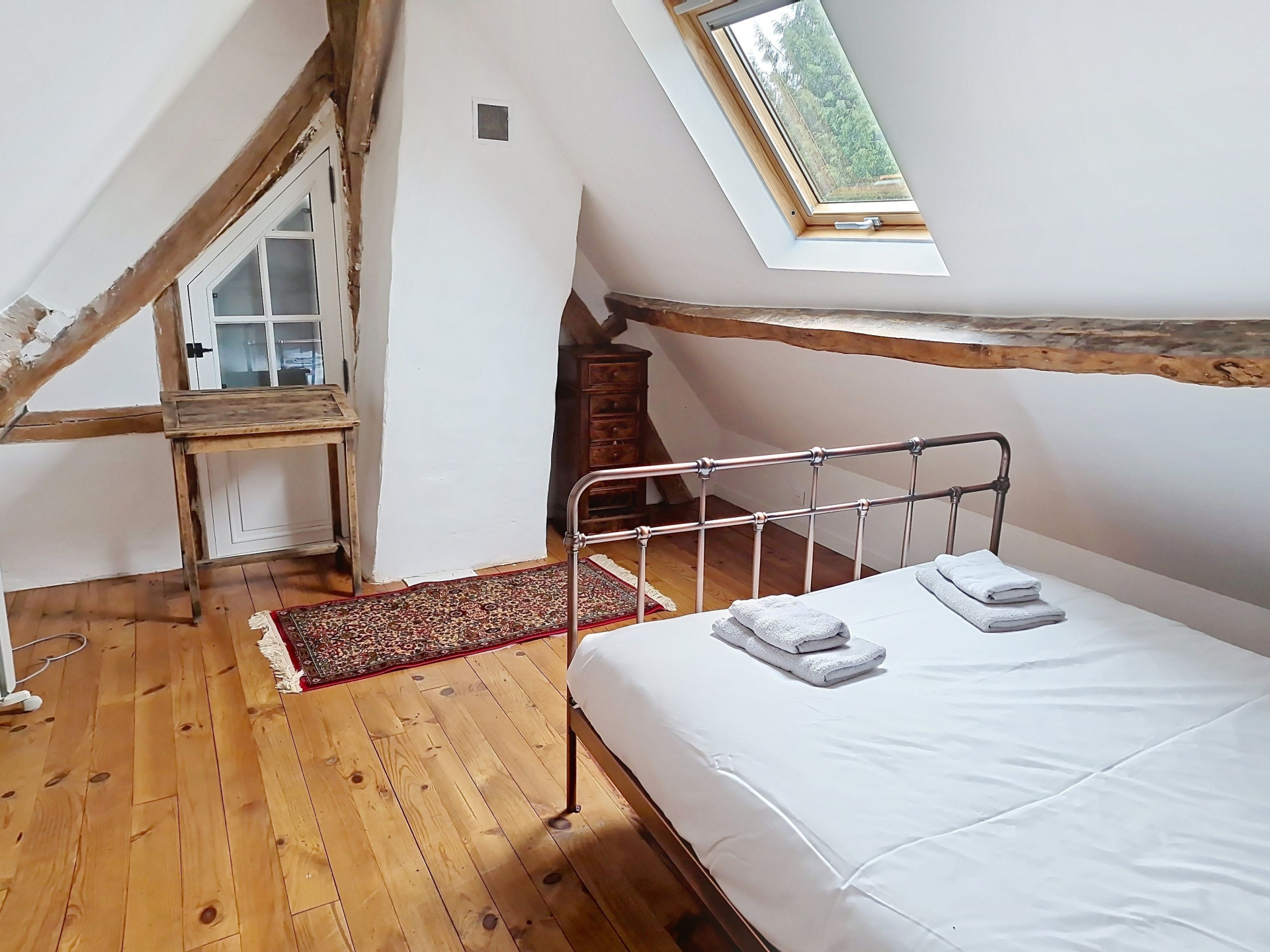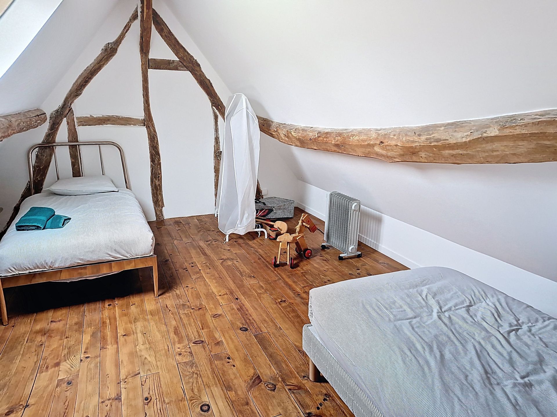 Jolie longère sur un terrain plat et arboré, au calme, dans un village recherché, comprenant au rez-de-chaussée : une cuisine, une buanderie, une salle d'eau avec WC, un salon avec poêle à bois et une chambre avec cheminée/insert, à l'étage : un grand palier et deux chambres. Garage. Jardin clos de 1300 m² env.