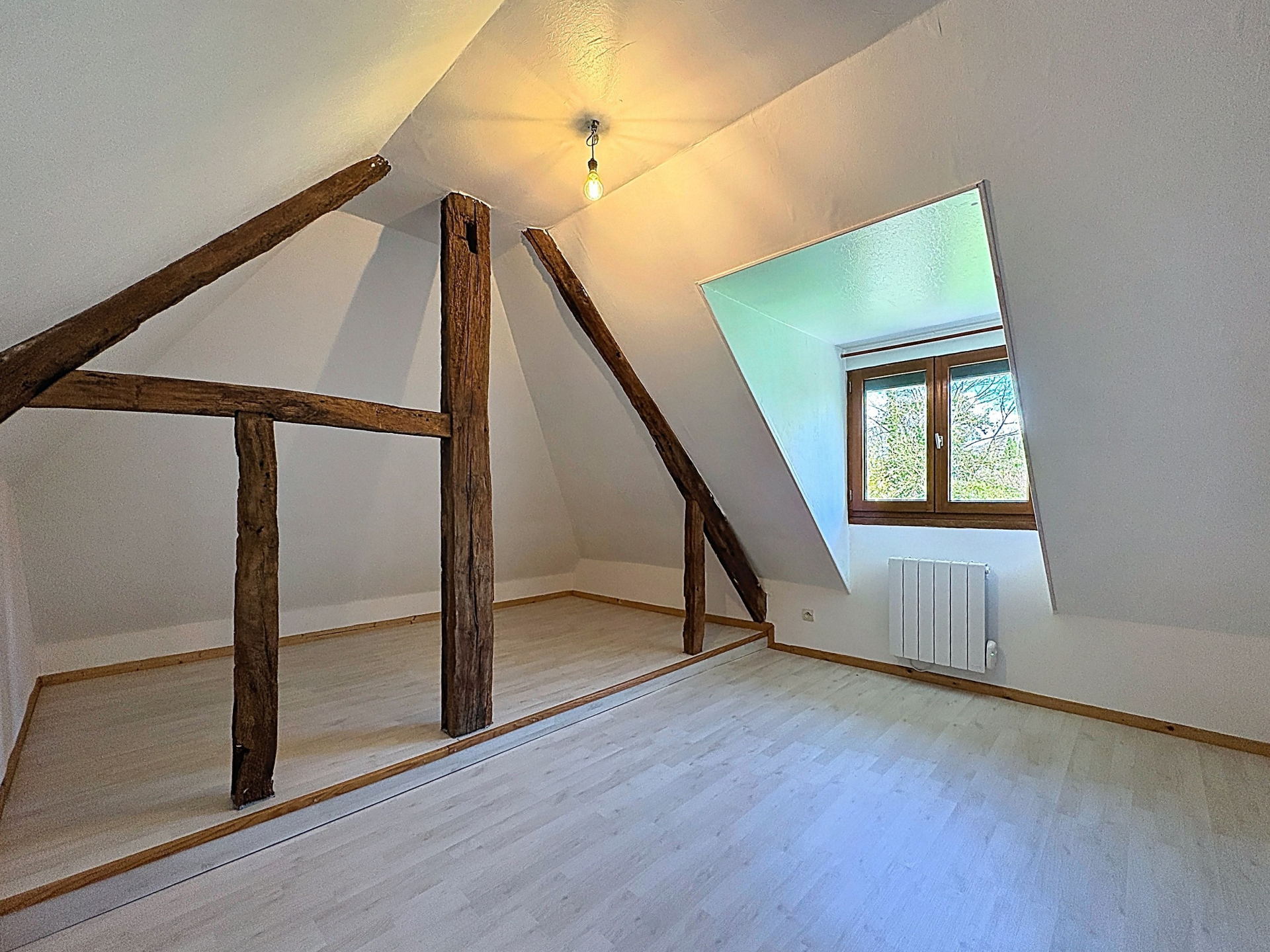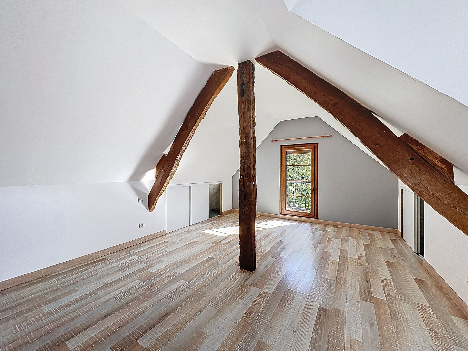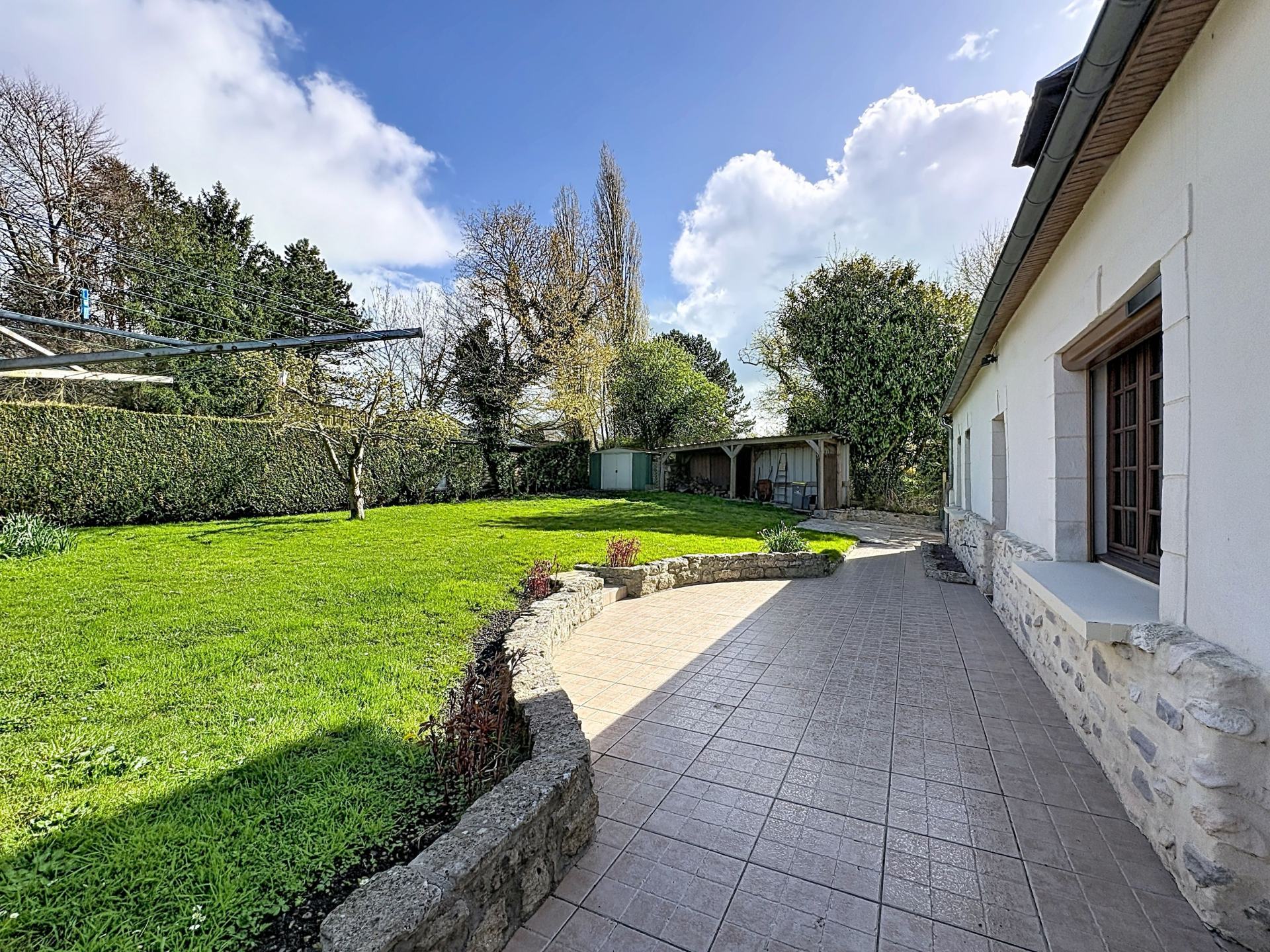 A vendre, belle longère de 102m² au calme avec vie de plain-pied comprenant au rez-de-chaussée, une entrée, une cuisine aménagée, un séjour double de 26m², première chambre, un couloir donnant sur la salle de bain avec double vasque et accès à un beau dressing.