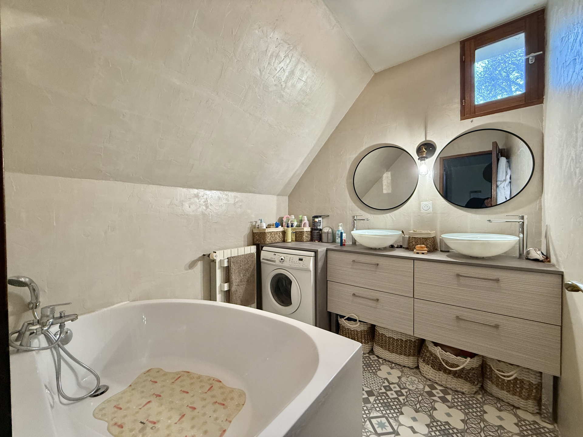 À l'étage : pièce palière desservant 3 chambres, dont une passante, un wc séparé ainsi qu'une salle de bains. Nombreux rangements.
