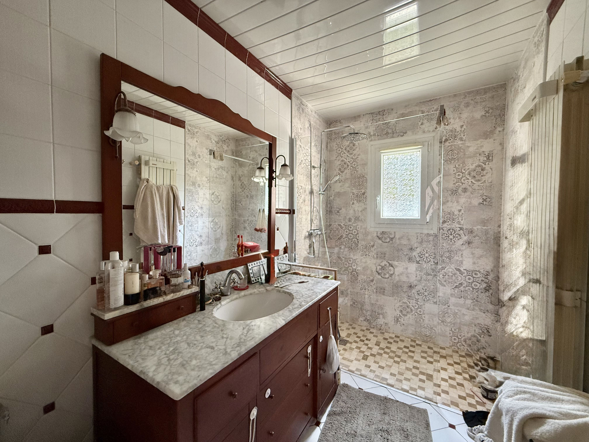 En extérieur : un accès véhicule ( parking d'environ 6/7 voitures ), un garage, une terrasse à l'abri des regards.. le tout sur un terrain sans vis à vis d'environ 1000m²!