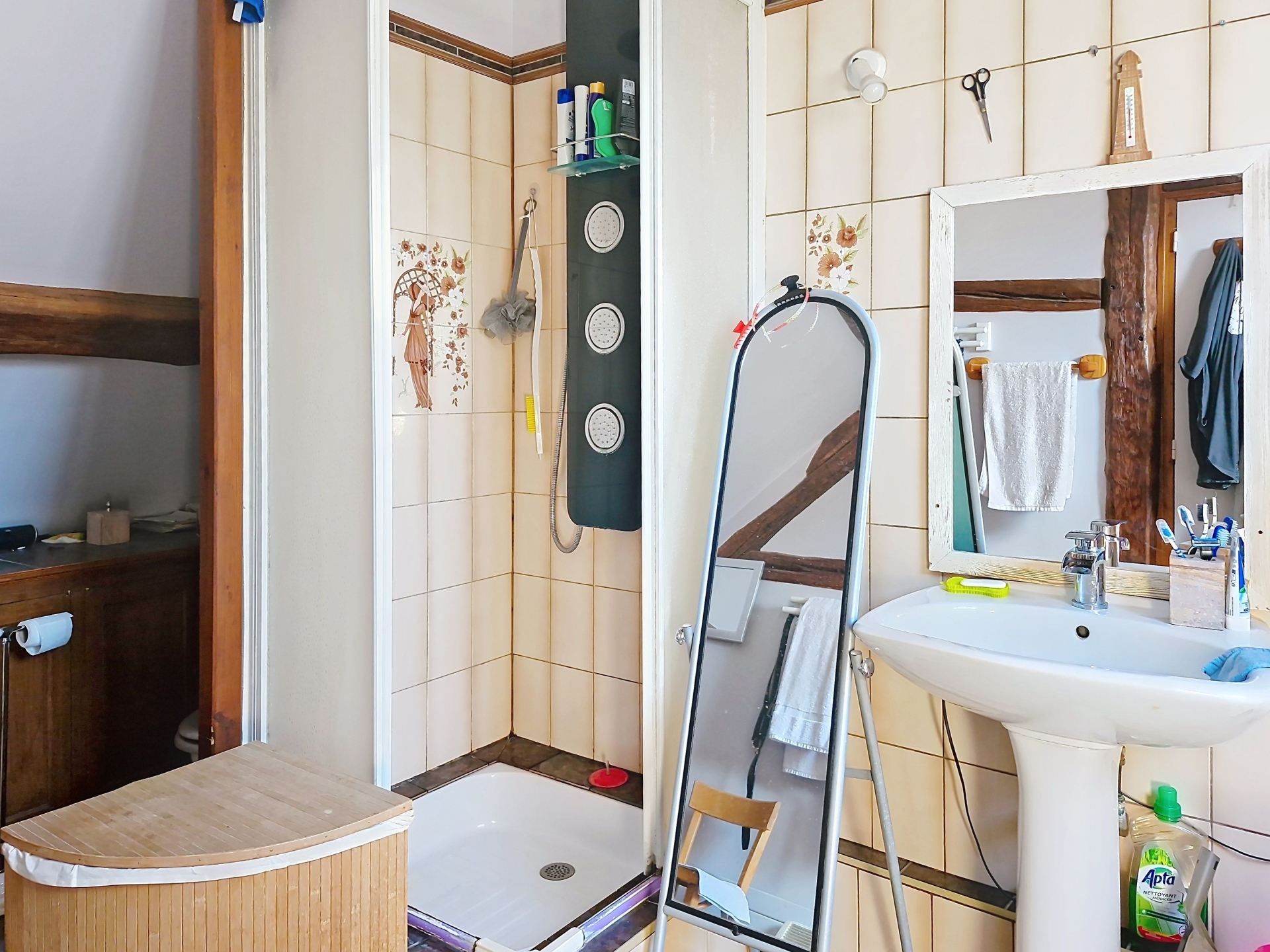 A l'étage: palier, salle de bains et douche, dégagement, 3 chambres.